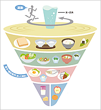 “餐飲平衡表”是2005年6月日本厚生勞動(dòng)省(日本政府醫(yī)療、勞動(dòng)部門)與農(nóng)林水產(chǎn)省一起針對(duì)飲食生活標(biāo)準(zhǔn)采取的具體活動(dòng)之一!安惋嬈胶獗怼敝蟹譃橹魇场⒅鞑、配菜,按照相應(yīng)的比例體現(xiàn)在圖表中。讓人們可以清楚的看到“吃什么”“吃多少”。
